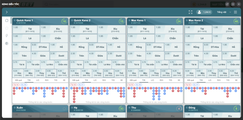 - Cược cơ bản: Tài/Xỉu, Lẻ/Chẵn, hoặc Ngũ Hành.