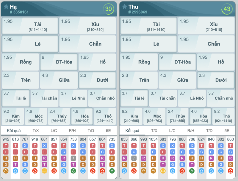 - Rồng/Hòa/Hổ: Rồng (chẵn), Hổ (lẻ), Hòa khi chữ số hàng chục và đơn vị bằng nhau. Tỷ lệ 1.95.